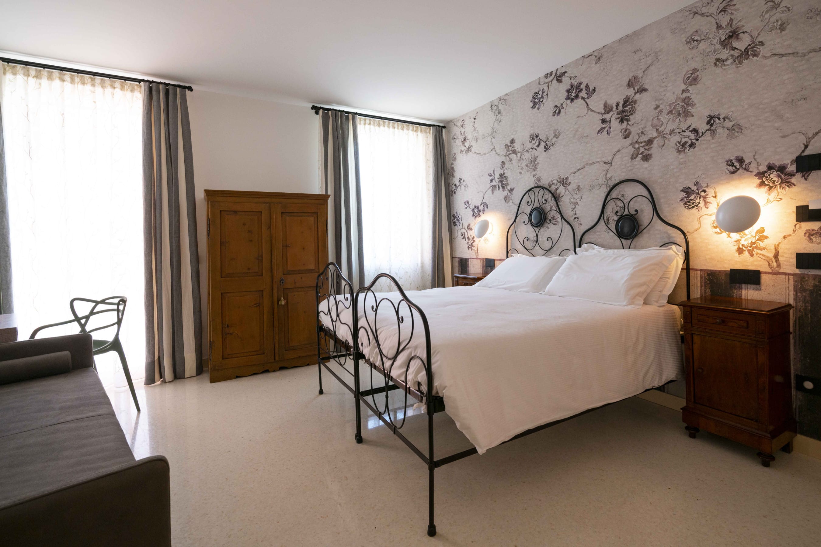 I tralci e i piccoli fiori della carta da parati accolgono “l’ospite” della stanza, facendolo subito sentire a proprio agio. L’eleganza dei due letti singoli in ferro battuto, il calore e le proprietà terapeutiche date dal legno Cirmolo dell’armadio contribuiscono a creare un’atmosfera di serena intimità. Il mosaico di Bisazza, bianco a greche dorate, presente nel bagno, conferisce alla stanza un ulteriore elemento di raffinatezza e ricercatezza.